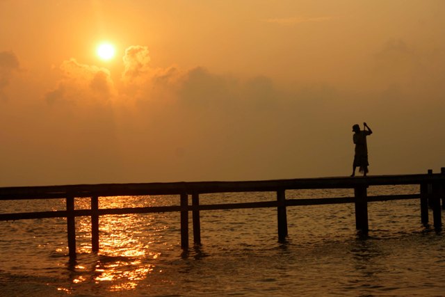 Pagi harinya kami pun langsung mencari spot sunrise. Pantai terlihat lebih luas karena air surut. Matahari terhalang oleh awan di horison, sehingga kami harus menunggu beberapa saat untuk melihat sunrise kesiangan itu. Setelah puas menikmati sunrise kami berputar mengelilingi pulau yang hanya ditempuh dalam 10 menit saja.