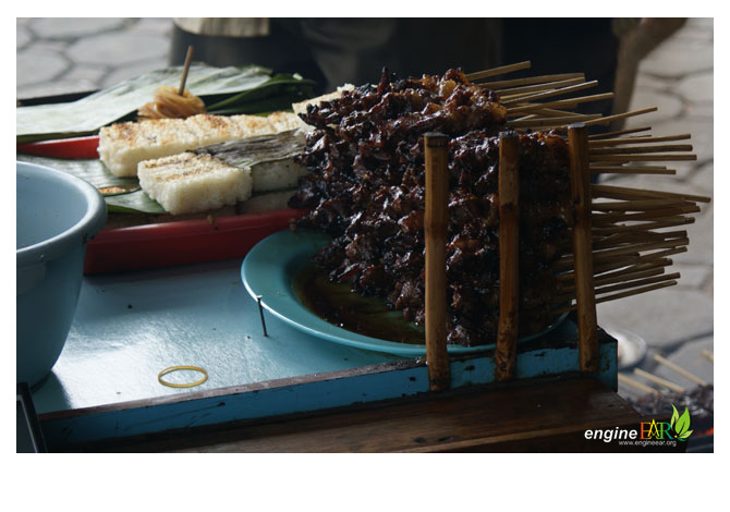 Sate ini adalah sate daging sapi. Selain rasa yang special, ada yang unik dari saus bumbunya. Bukan saus bumbu kacang bukan pula hanya bumbu kecap seperti sate pada umumnya, tapi berupa saus oncom yang merupakan perpaduan cuka lahang, ketumbar, kecap dan cabe. Kamu bisa memakannya dengan nasi atau ketan (jadah) bakar. Dan paling sip adalah aroma daging mentah sapinya tidak menusuk. Hmm….enak banget. Apalagi di sini kita tidak perlu memesan terlebih dahulu, tinggal ambil sate – sate yang sudah dibakar si penjual  di dekat pembakaran sate. Demikian pula dengan nasi dan jadahnya. Karena memang warung ini di kemas selayaknya prasmanan, walau menunya cuman sate :). Jangan kawatir berebut dengan pembeli lainnya ( selalu rame lho ..) karena si penjualnya ga akan berhenti membakar sate sampe selama di situ masih ada pelanggan.