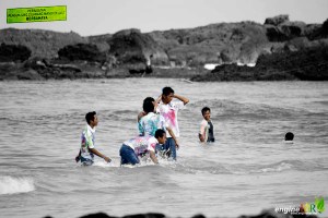 Akhirnya pada pukul 14:54 kita sampai juga di pantai, aroma laut tercium begitu keluar dari mobil, cuaca ternyata sangat cerah di sini. Tempat parkir sudah banyak tersedia. Warung-warung dengan hiasan kelapa muda di bawah pepohonan berjejer rapi dengan Toilet diujung. Beberapa polisi tampak berjaga-jaga untuk mengamankan suasana yang dimeriahkan oleh para anak SMA yang merayakan kelulusannya. Kita langsung berlari menuju pantai dan melihat hamparan pasir putih, batu-batu di tepi pantai, air laut yang biru kehijauan, dan pulau-pulau kecil membuat suasana begitu indah.