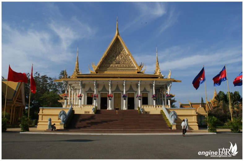 Bangunan pertama yang terlihat adalah Throne Hall. Tidak boleh motret interiornya, ga seru. Sekedar deskripsi , hampir semuanya berwarna kuning keemasan, dari furniture, tiang, dinding, patung dan atap. Bangunan ini bergaya tradisional Khmer yang artistik dan terinspirasi desain Angkorian, plus beberapa elemen gaya Eropa.