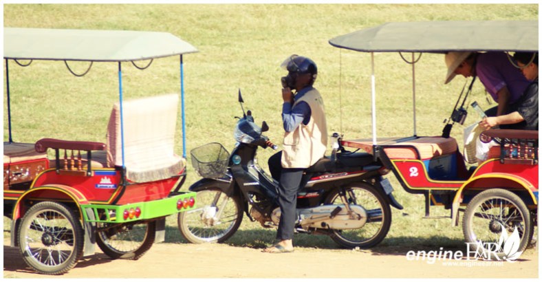 Tuk Tuk Kamboja yang aku temui di Siem Rap beda lagi. Ini tak lebih dari motor bebek yang di attach kereta roda dua yang disambungkan di jok belakang motor. Ga lagi beroda tiga tapi beroda empat. Posisi tempat duduk adalah berhadapan depan belakang. Secara reability mungkin ga sehandal Tuk Tuk Bangkok yang benar – benar terintegrasi satu. Sama dengan Tuk Tuk Thailand, Tuk Tuk Kamboja juga tanpa pintu pengaman di kanan kiri.