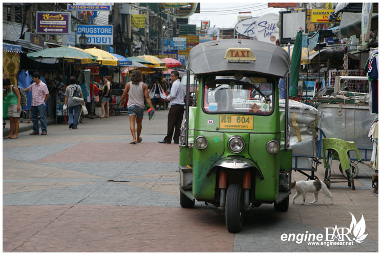 Di Bangkok, desain Tuk Tuk nya paling mirip Bajaj, meski lebih luas sedikit. Tapi lebih berwarna warni, lengkap dengan bendera Thailand dan panji Rajanya. Posisi duduk penumpang lebih tinggi dari posisi driver. Tempat duduk penumpang hanya satu. Cukup untuk berdua. Tidak ada pintu di kanan kiri. Kurang safety, tapi asyik.