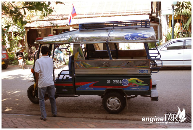 Mungkin Tuk Tuk laos adalah yang paling tangguh. Ukurannya paling besar hampir sepanjang angkot . Desainnya adalah setengah motor dengan tangki depan ( biasa disebut motor lanang kalo dijawa )yang disambung dengan gerobak. Posisi duduk berhadapan kanan kiri. Jadi bisa diisi lebih banyak penumpang dan barang daripada kedua “ saudaranya”. Kamu bisa duduk disamping driver lho. Dari ketiganya yang sama adalah untuk menggunakan jasanya kita harus bargaining terlebih dahulu.